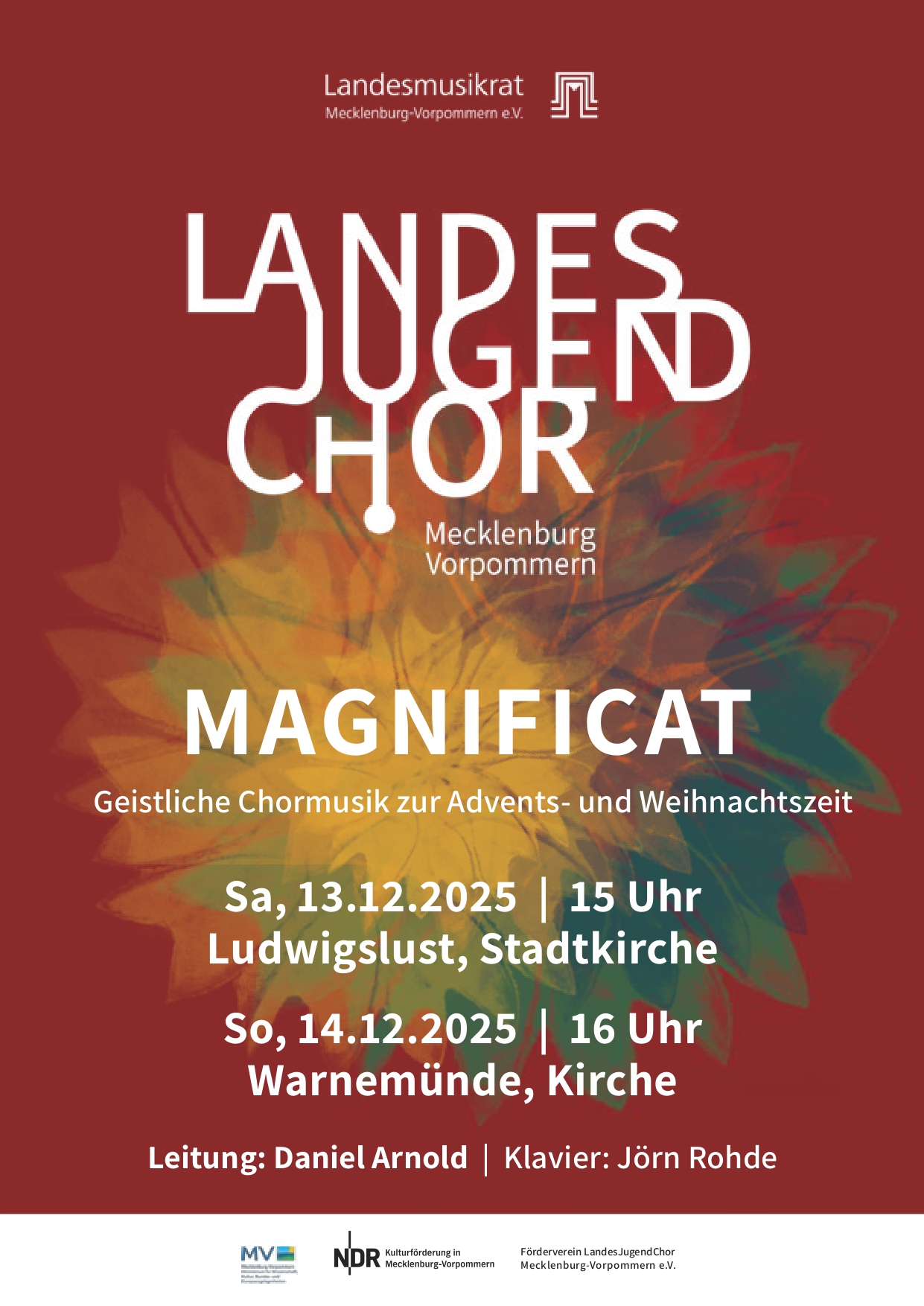 Am Wochenende des 3. Advent ist der Landesjugendchor M-V in zwei Konzerten zu erleben.Im Rahmen der Schlossweihnacht singt der LJC unter der Leitung von Daniel Arnold am 13.12.2025 um 15 Uhr in der Stadtkirche Ludwigslust sowie am 14.12.2025 um 16 Uhr in der Kirche Warnemünde. Auf dem Programm ... Weiterlesen